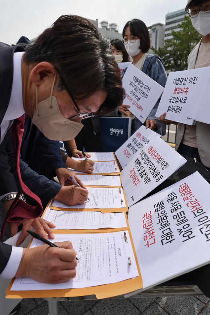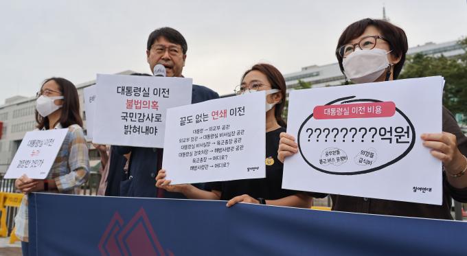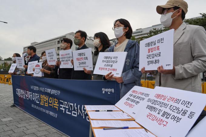 참여연대가 28일 오전 서울 용산 대통령실 앞에서 기자회견을 열고 '대통령실·관저의 이전과 비용 사용 등에 있어 불법 의혹에 대한 국민감사청구' 추진 계획을 밝혔다. 참여연대는 "대통령실의 이전 결정, 이와 관련한 비용의 책정과 집행에서 직권남용과 부패행위가 없었는지, 공적인 의사결정과정에 부당한 영향력의 개입이 없었는지 여부 등이 감사를 통해 규명되어야 한다"고 주장하며 이날부터 '국민감사청구'를 위한 연서명에 돌입했다.