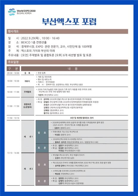 포럼은 이날 오전 10시 벡스코 컨벤션홀에서 열리는 개회식을 시작으로 오전과 오후로 나눠 진행된다. 개회식에는 이영활 부산상공회의소 상근부회장, 엑스포 관련 전문가, 교수, 시민단체 관계자, 온라인 사전등록 참석자 등 총 100여 명이 참가한다.