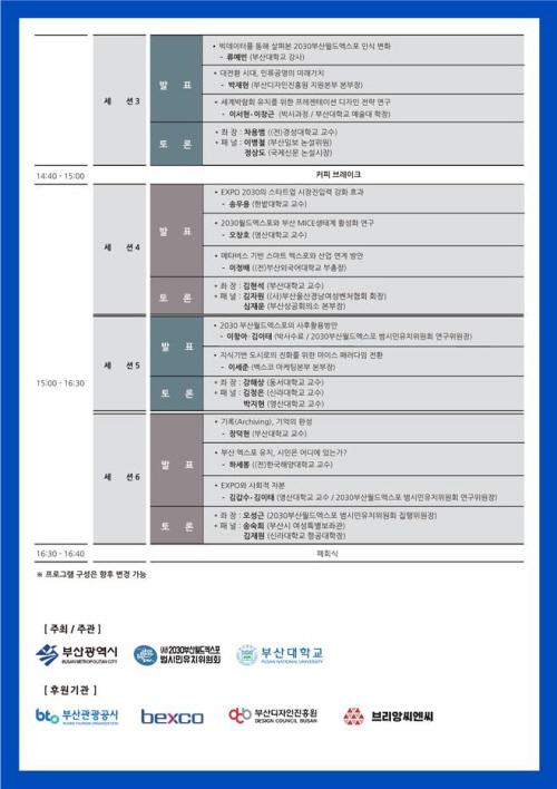 이번 포럼은 '엑스포의 가치와 부산의 미래를 논하다'를 주제로 2030세계박람회 개최지 후보도시 실사 및 경쟁 PT에 대비한 분야별 전문가들의 실질적 협력을 증진하기 위해 마련됐다. 부산시, 범시민유치위원회, 부산대 경제통상연구원 엑스포·마이스연구센터가 공동 주최·주관한다.