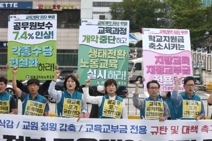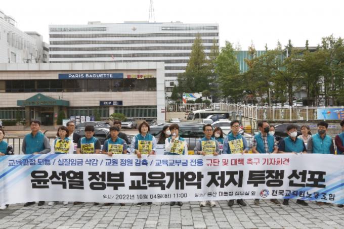 전희영 전국교직원노동조합(전교조) 위원장과 조합원들이 4일 오전 서울 용산구 윤석열 대통령 집무실 앞에서 열린 '윤석열 정부 교육 개악 저지 투쟁' 선포 기자회견에서 구호를 외치고 있다. 참가자들은 유초중고의 예산깎기 중단, 실질임금 삭감에 따른 각종수당 현실화, 교원정원 확보, 교육교부금 전용 금지 등으로 공교육을 정상화할 것을 주장했다.