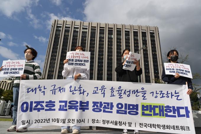 이주호 교육부 장관 후보 임명에 반대하는 전국대학학생회네트워크가 5일 오전 정부서울청사 앞에서 기자회견을 열고 입장을 발표하고 있다. 전국대학학생회네트워크는 학교 운영의 자율성을 강조하며, 교육 효율성만을 강조하는 이주호 장관 후보자 임명은 즉각 철회되어야 한다고 주장했다.