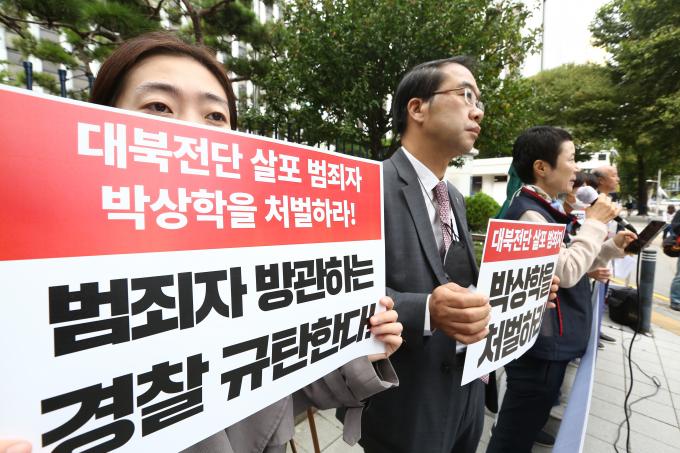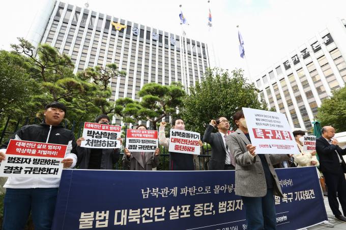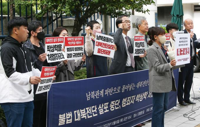 6일 서울 서대문구 경찰청 앞에서 전국민중행동 주최로 열린 '불법 대북전단 살포 중단! 범죄자 박상학 처벌촉구!' 기자회견에서 참가자들이 남북관계 파탄으로 몰아넣는 대북전단 살포를 금지하고, 이를 주도하는 박상학 씨를 강력 처벌하라고 촉구하고 있다.