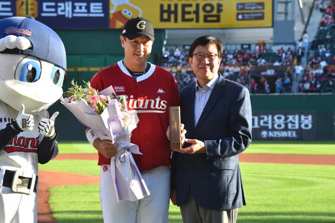 박형준 시장은 이날 사직운동장을 찾아 경기에 앞서 이대호 선수에게 홍보대사 위촉패를 전달했다.