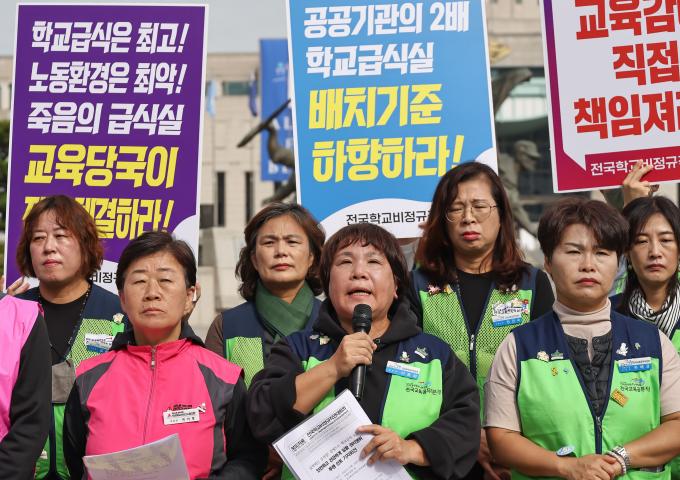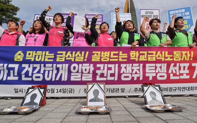 전국학교비정규직연대회의 소속 학교급식 노동자들이 14일 오전 서울 용산 대통령실 앞에서 "안전하고 건강하게 일할 권리 쟁취 투쟁 선포 기자회견"을 열었다. 참석자들은 학교급식노동자들의 폐암건강검진 결과 임상적 '폐암의심'단계에 속하는 근로자의 유병율이 일반인의 27배 가량 보이고 있다고 주장했다.