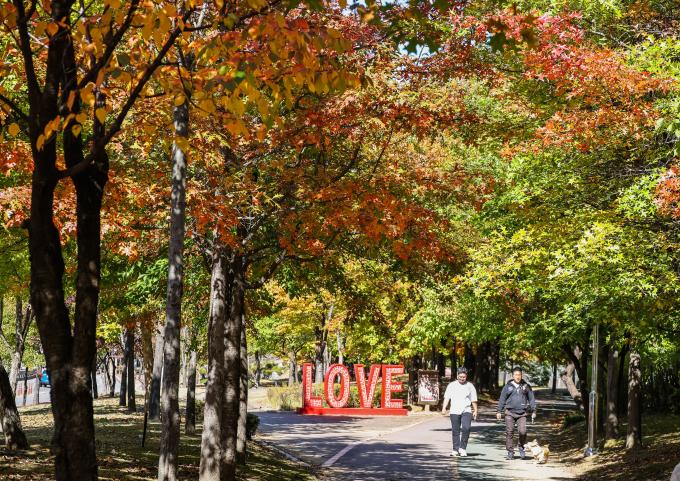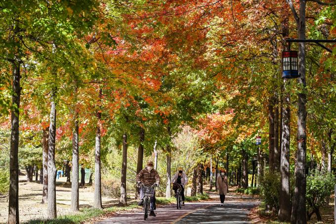 고양시 경의선 숲길에도 가을이 찾아왔다. 큰 일교차로 올가을 단풍 색깔이 더욱 선명하다. 17일 아침 기온은 뚝 떨어졌지만 낮에는 기온이 올라 시민들은 따뜻한 공원길을 산책하고 자전거를 타고 가을을 만끽했다. 기상청은 오는 18일은 기온이 더 낮아져 서울은 4도까지 떨어지고 일부 지역은 서리가 내리거나 물이 어는 곳도 있을 것으로 예상했다.