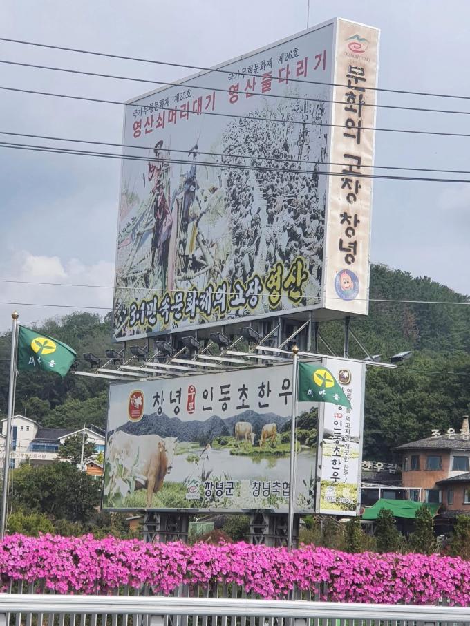 18일 창녕군에 따르면 군은 지난 2007년 국도변인 영산면 동리 443-8(하천) 지역에 가로 7m 높이 11m 규모의 대형 홍보탑을 설치했다. 이곳에는 현재 국가무형문화재 영산쇠머리대기·영산줄다리기, 창녕 우포 인동초 한우 홍보물이 게재돼 있다.
