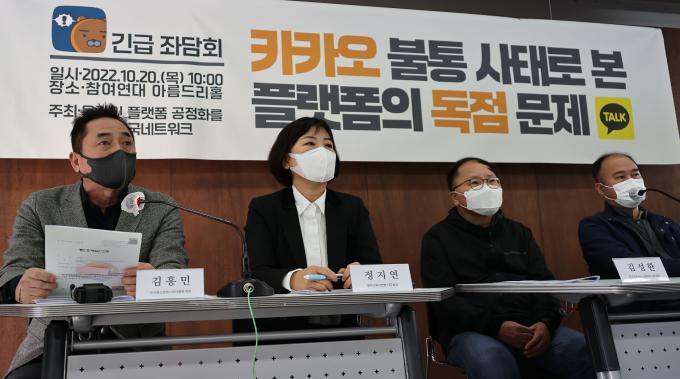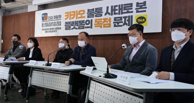 20일 오전 서울 종로구 참여연대 아름드리홀에서 '카카오 불통 사태로 본 플랫폼의 독점 문제'를 주제로 한 긴급좌담회가 열렸다. 이날 발표자들은 "국민 대다수가 사용하는 메신저, 결제 및 예약 서비스 등이 국민들의 삶에 필수요소가 되었음에도 이들의 위기 대처 능력은 한없이 부족하다는 것이 이번 사고로 인해 드러났다"고 밝혔다. 또한 "특정 플랫폼 기업에 국민의 삶이 종속될 경우 어떠한 비극이 벌어질 수 있는지 보여주는 명백한 사례"라며 "이번 사태에 대하여 철저한 조사 및 배상이 이뤄져야 함과 함께 구체적인 관리·감독을 하지 않았던 정부의 책임도 매우 크다"고 주장했다.