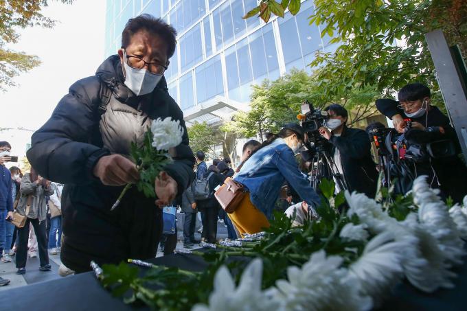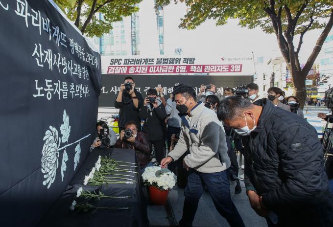 70여 시민단체들이 참여한 '파리바게뜨 노동자 힘내라' 공동행동이 20일 오후 서울 양재동 SPC 본사 앞에서 평택 SPC 계열사 SPL 제빵공장 산재 사망 사고 희생자를 기리는 추모행사를 열었다.