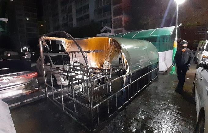 21일 새벽 3시께 부산시 해운대구 좌동의 한 아파트 분리수거장에서 불이 났다.
