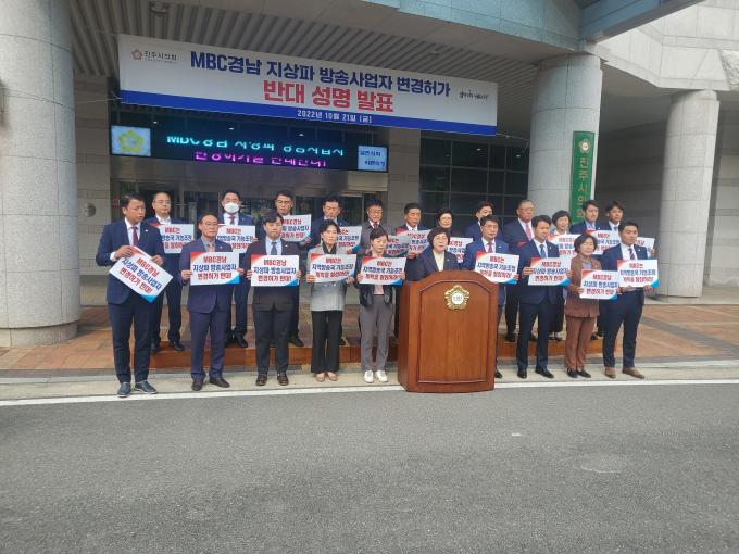 진주시의회 양해영 의장을 비롯한 22명의 시의원 전원은 21일 의회 앞에서 'MBC경남 지상파 방송사업자 변경허가 반대 성명'을 발표했다.