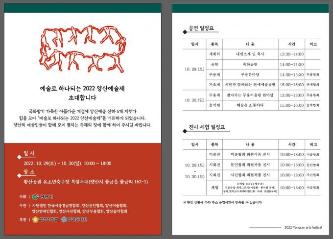 지역 문화예술 저변 확대를 위해 마련되는 양산예술제는 매년 10월 열리는 '양산국화향연'과 함께 병행, 가을 야외에서 펼쳐지는 문화행사의 진면목을 볼 수 있는 기회다.