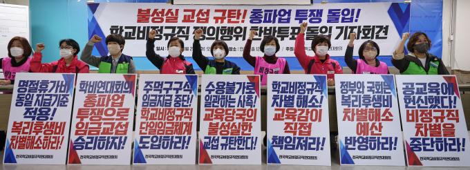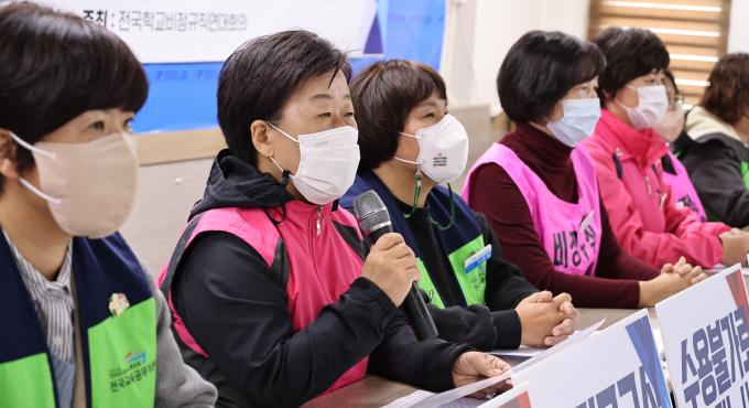 학교비정규직연대는 "9월14일 1차 본교섭을 시작으로 두 차례의 본교섭과 네 차례의 실무교섭을 진행했지만 교육부와 17개 시·도 교육청은 기본인 사용자 안조차 제시하지 않고 수용 거부 입장만 반복하고 있다"며 "현재와 같은 무책임하고 불성실한 교섭이 지속된다면 11월 8일까지 쟁의행위 찬반투표를 진행하고 11월 실질적 파업 준비에 돌입하고자 한다"고 밝혔다.