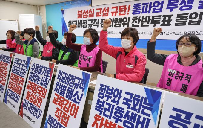 25일 서울 중구 민주노총 회의실에서 열린 전국학교비정규직연대회의의 '학교비정규직 쟁의행위 찬반투표 돌입 기자회견'에서 참석자들이 불성실 교섭 규탄 및 학교비정규직 차별 해소를 촉구하는 구호를 외치고 있다.