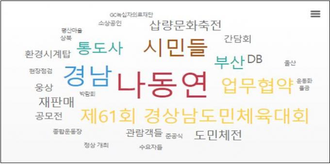 특히 낙동강유역 상생협력, 도민체전, 통도사 미디어아트, 반다비 체육관 등에 대한 긍정 키워드(기대·노력)가 뚜렷한 것으로 조사됐다. 또 철거·혐의·강제 등 부정 키워드는 평산마을 집회 관련으로 확인됐다.
