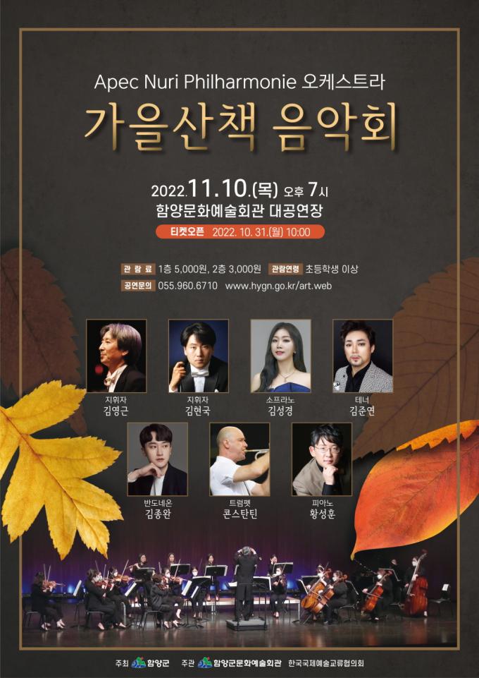 '가을산책 음악회'에는 부산 해운대에서 활동하고 있는 APEC누리 필하모닉 오케스트라(지휘자 김현국·김영근)가 쇼팽·시벨리우스·롯시니 등 음악거장의 작품과 우리들에게 익숙한 밀양아리랑 등 다양한 선율을 선사한다.