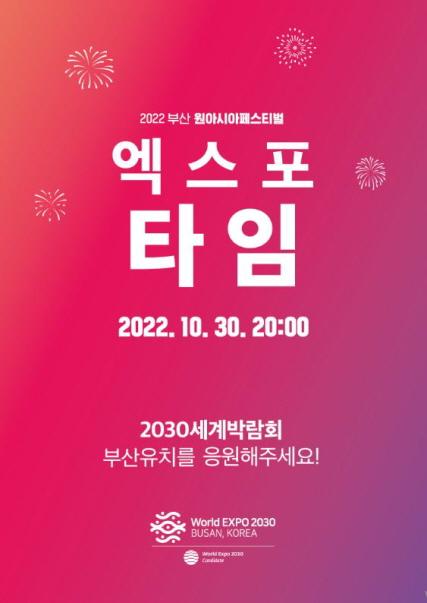 콘서트 본공연 시작 직전인 8시에 시작되는 '엑스포 아워'에서는 참가자 전원이 '2030세계박람회 부산에 유치해'라는 응원 함성으로 유치 의지를 다진다.