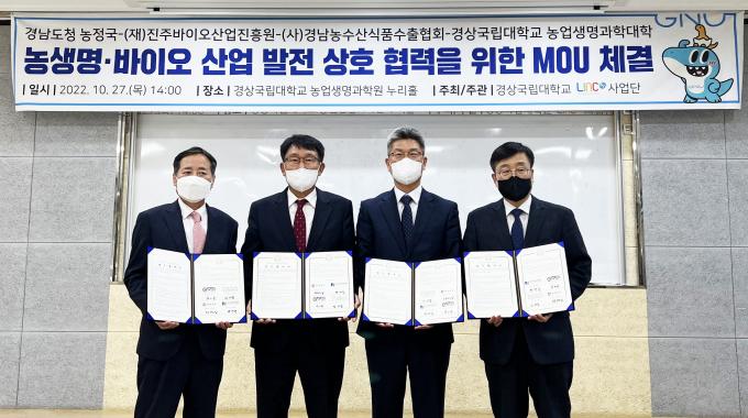 이날 협약식에는 대학 측에서 김민철 농업생명과학대학 학장과 김삼철 농생명·바이오 ICC 센터장을 비롯해 정연상 경남도 농정국장, 정영철 진주바이오산업진흥원장, 김의수 경남농수산식품수출협회 회장 등이 참석했다.