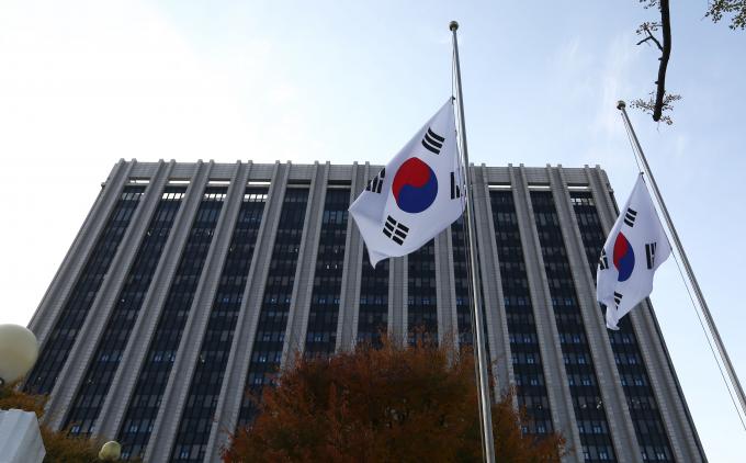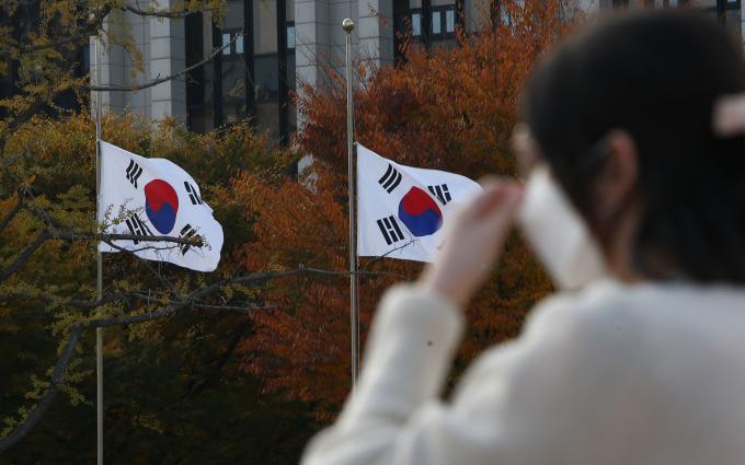 이태원 참사로 국가애도기간이 선포된 가운데 30일 정부서울청사 국기 게양대에 조기가 게양되어 있다. 조기는 깃면의 세로만큼 내려서 달며, 현충일과 국장기간, 국민장 및 정부지정일에 게양한다.