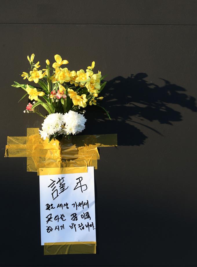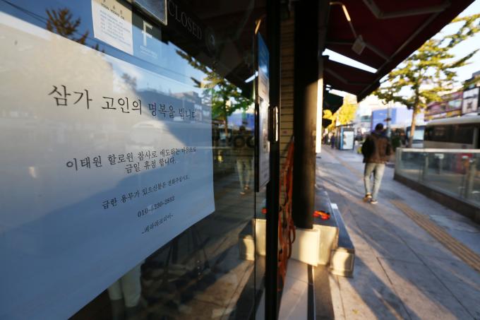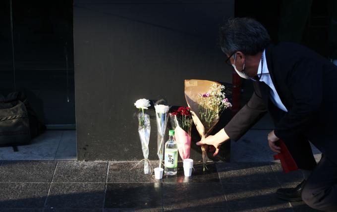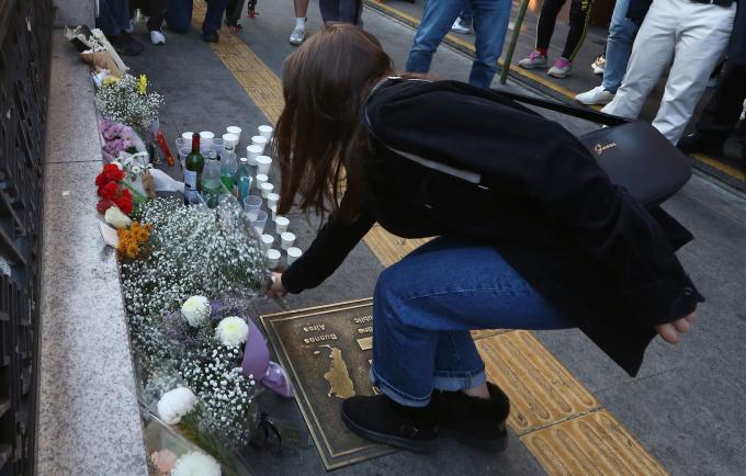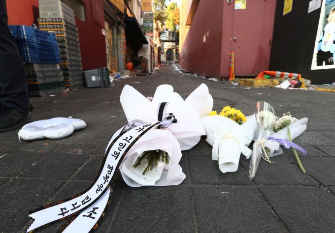 30일 오후 서울 이태원 참사 현장 인근에서 한 시민이 희생자들을 추모하며 헌화하고 있다. 국가애도기간이 선포되고, 모든 관공서에 조기가 게양된 가운데 사고 현장과 주변 지하철역에는 시민들이 갖다 놓은 조화와 촛불이 하나둘 늘고 있다. 일부 상가들은 문을 닫았다.