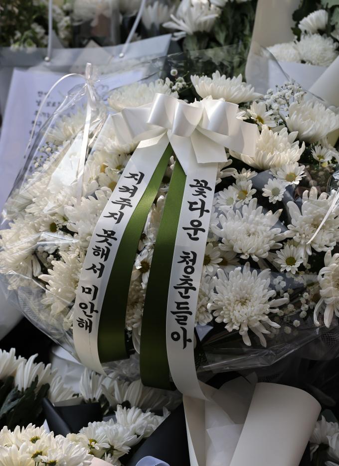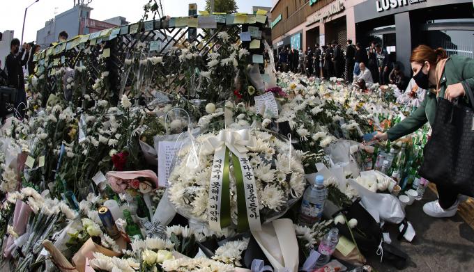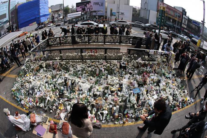 1일 오후 이태원 사고 현장 바로 앞 희생자 추모공간은 고요했다. 조화와 촛불, 희생자들 사진과 추모 메시지가 가득할 뿐이었다. 스님의 목탁소리도 무겁게 가라앉았다. 그렇게 모두 숨죽이고 희생자들의 넋을 기리는 모습이었다.