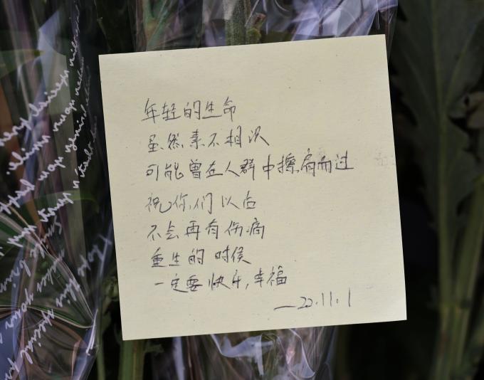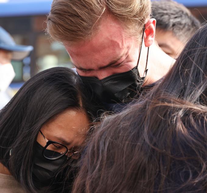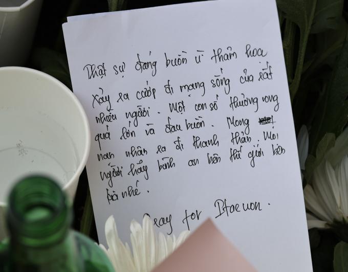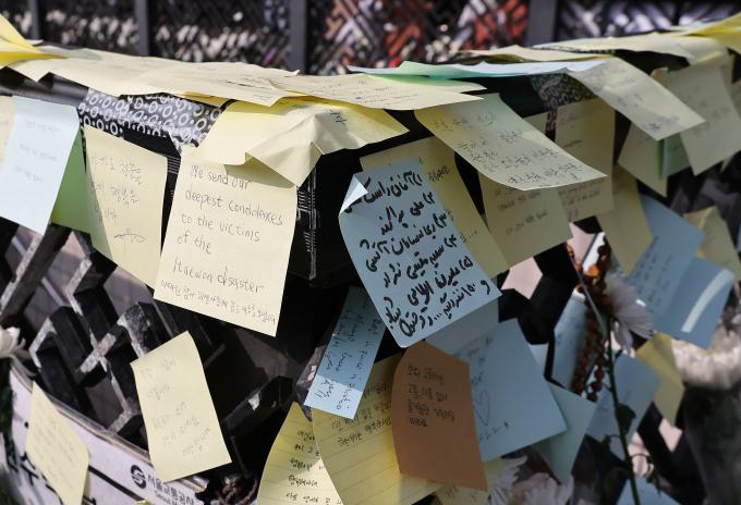 조화를 놓고 돌아서는 이들의 국적 만큼 추모 메모지의 언어도 다양했다. 희생자 중엔 14개국 외국인 26명이 포함돼 있다. 어느 외국인은 친구가 좋아하던 과자를 한 봉지 놓고 묵념했다. 또 다른 이는 친구들을 안고 한동안 울음을 삼켰다.