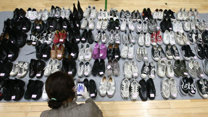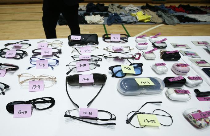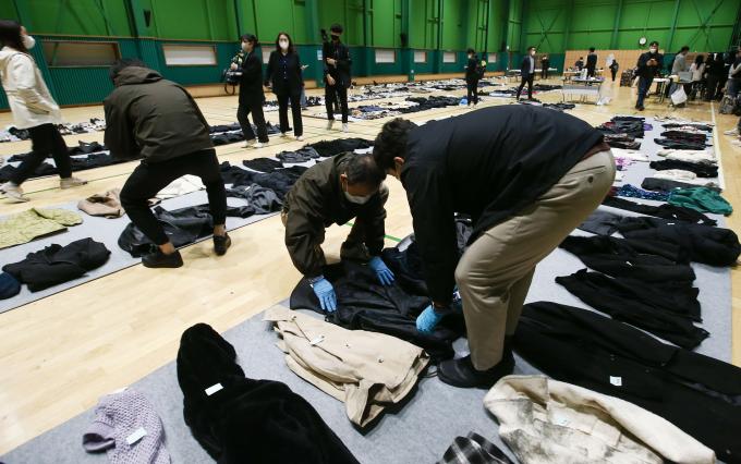 1일 서울 용산구 원효로 다목적 체육관에 마련된 '이태원 참사' 유실물 센터에서 경찰관들이 현장에서 가져온 유실물들을 정리하고 있다. 유실물 센터는 오는 6일까지 운영된다.