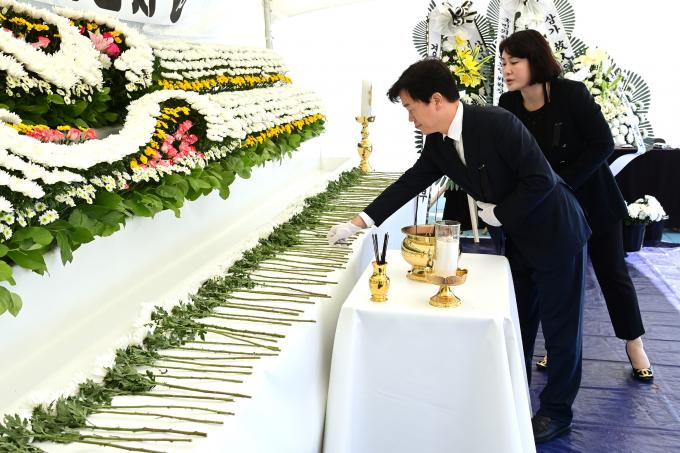 조규일 시장은 비통하고 안타까운 마음을 담아 조문록을 작성한 후 국화 한 송이를 헌화하고 묵념했다.