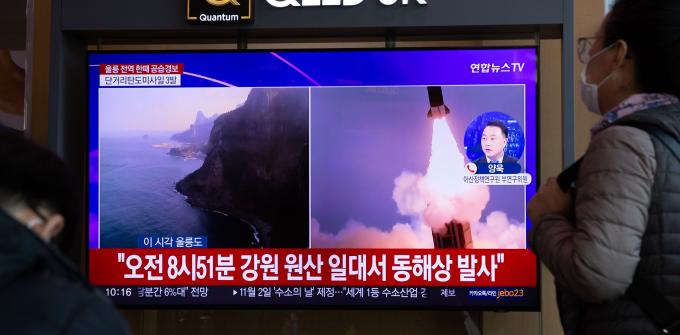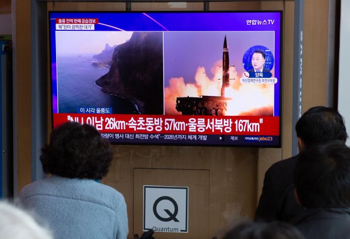 2일 오전 서울역 대합실의 TV에서 북한의 미사일 도발을 알리는 뉴스 속보 자막이 떠 있다. 이로 인해 울릉도에 한때 공습경보가 발령됐다. 북한은 10발 이상의 미사일을 동·서해상으로 발사했고, 탄도 미사일 중 1발은 북방한계선(NLL) 이남 해역에 떨어졌다.