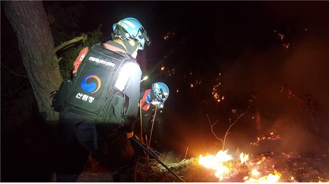산림청과 소방당국은 진화대원 74명(산림공무원 등 48명, 소방 26명), 진화차 2대, 소방차 9대를 투입해 신고를 받은 지 40분 만에 주불을 진화한 뒤 잔불을 밤 늦게까지 정리했다.