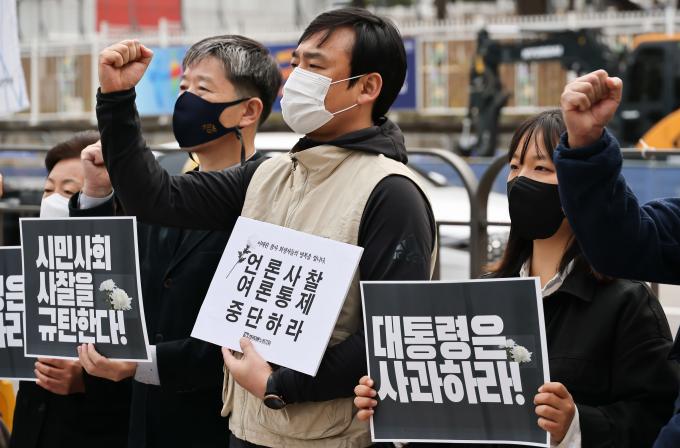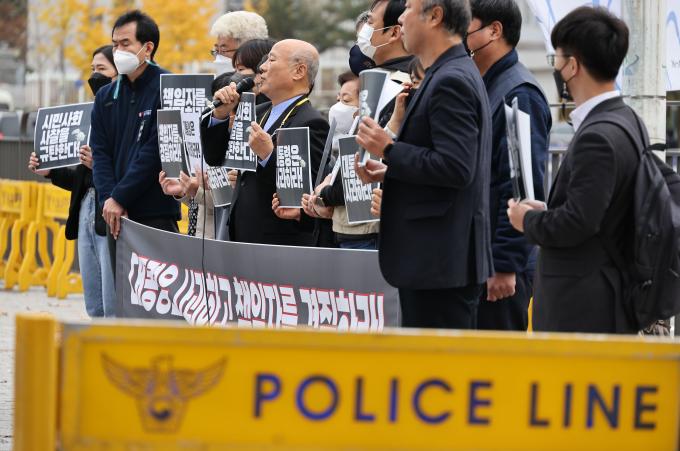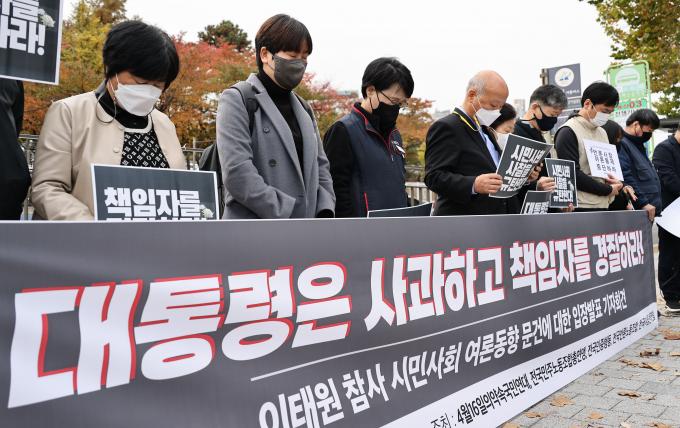 전국민중행동과 민주노총 등 시민사회단체들이 3일 오전 서울 용산 대통령실 앞에서 '이태원 참사 시민사회 여론동향 문건에 대한 입장 발표' 기자회견을 열었다. 기자회견 참석자들은 "지난 31일 경찰청이 시민사회단체들의 여론을 파악해 대통령실에 보고한 '정책참고자료'라는 문건에서 보듯 참사 수습과 대책 마련에 힘을 쏟아야 할 정부가 시민사회 사찰을 통해 정권의 안위만을 생각하며 여론무마 대응에만 골몰하고 있다는 점에서 충격을 주고 있다"고 밝혔다. 이에 이번 참사를 '인재(人災)'로 규정하고 대통령의 사과와 책임자 경질을 촉구했다.