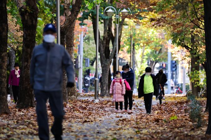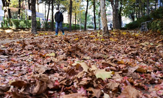 올가을 들어 가장 낮은 기온을 보인 4일 아침, 경기 고양시의 한 아파트 단지 공원에 수북하게 쌓인 낙엽을 밟으며 따뜻한 옷차림의 행인들이 지나가고 있다. 기상청은 강원도 일부와 경기 북부 지방의 기온이 영하 5도까지 떨어진 가운데 새벽부터 아침 사이 내륙 대부분 지역에는 서리가 내리는 곳이 있겠다고 예보했다. 또한 중부 내륙과 전북 내륙, 경북 내륙에는 얼음이 어는 곳도 있겠으니 농작물 냉해에 유의할 것을 당부했다.