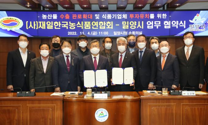 밀양시청 소회의실에서 진행된 업무 협약식에는 박일호 시장과 연합회 회장인 ㈜히토시나상사 김규환 대표이사를 비롯해 밀양시농업기술센터 소장, 신선농산물 품목별 회장 등이 참석했다.