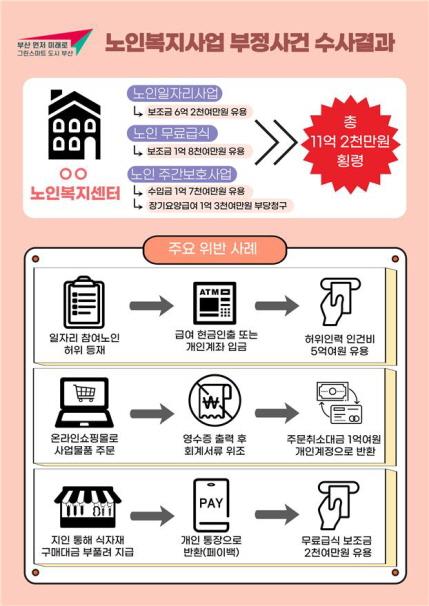 부산시 특별사법경찰과는 A 노인복지시설이 5년간 노인일자리·무료급식사업 보조금 등 총 11억2000만 원을 횡령한 사실을 적발, 시설장 및 회계담당 직원 등 전직 임직원 4명을 사회복지법 위반 혐의로 검찰에 송치했다고 6일 밝혔다.