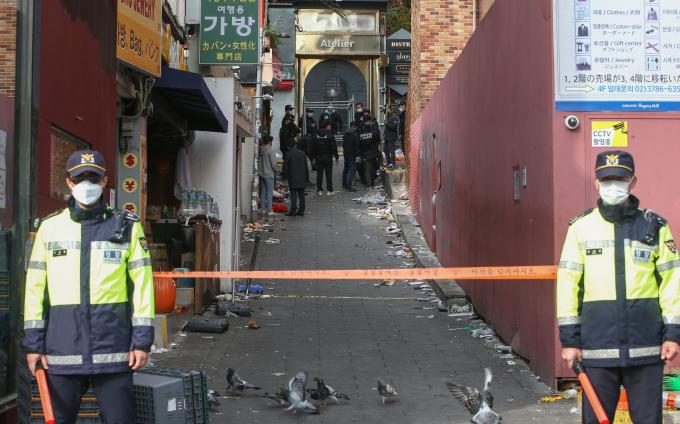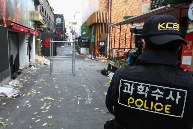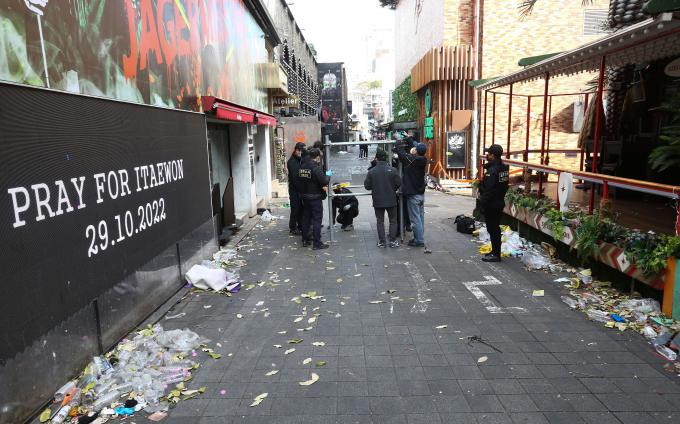 7일 오후 서울 용산구 이태원 참사 현장에서 경찰과 국립과학수사연구원 관계자들이 2차 현장 감식을 진행하고 있다. 1시간 정도 진행된 감식에서 경찰과 국과수는 가로, 세로 1m 안팎의 철제 구조물을 만들어 사고 당시 군중이 얼마나 밀집해 있었는지 측정했다. 특수본과 국과수는 3D 시뮬레이션 결과와 목격자 진술, CCTV 영상을 토대로 사고원인 규명을 위한 당시 상황 재구성에 주력할 방침이라고 밝혔다.