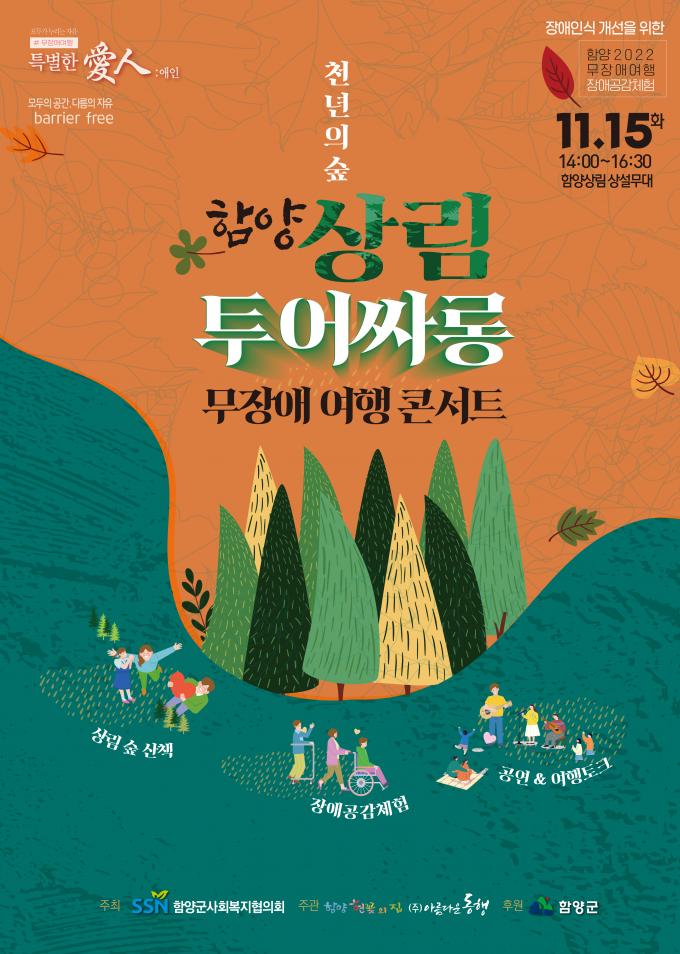 함양군 사회복지협의회(회장 정흥희)는 오는 15일 오후 2시 상림공원 토요무대에서 '상림 투어싸롱–무장애 여행콘서트'를 개최한다.
