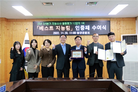 밀양서 지능범죄수사팀(팀장 손우승)은 보이스피싱 범죄 조직원 검거, 고보조금 부정수급 사범 검거, 보험사기범 검거 등 악성사기와 부정부패 척결에 기여한 공을 인정받았다.