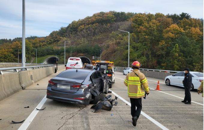 추돌로 생긴 파편이 날아가면서 인근을 지나던 쏘나타는 차량 타이어가 파손됐다. 경찰은 2개 차로를 통제해 사고처리를 했고, 후방 2.5㎞ 구간이 30분가량 정체를 빚었다.