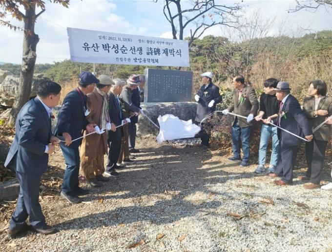 이날 제막식에는 진주 '남강문학협회' 문우들과 선생의 가족, 서점용 서상면장 등 70여 명이 함께하며 선생의 구순과 함께 선생의 시 '바우'(제2 시집 여로의 사람들) 시비 제막식을 축하했다.
