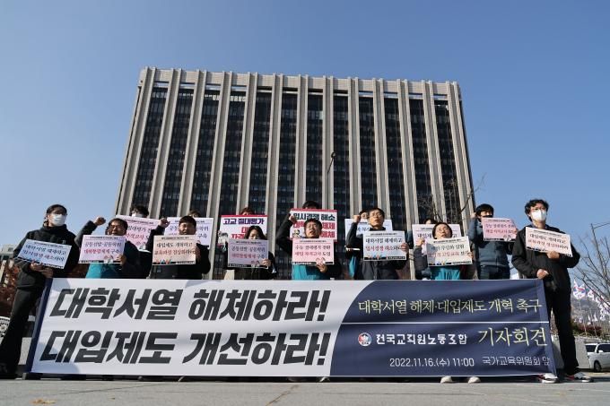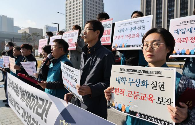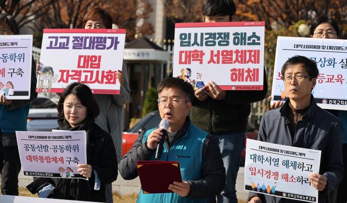 16일 오전 서울 종로구 정부서울청사 앞에서 전교조 주최로 '대학서열 해체·대입제도 개혁 촉구 기자회견'이 열렸다.