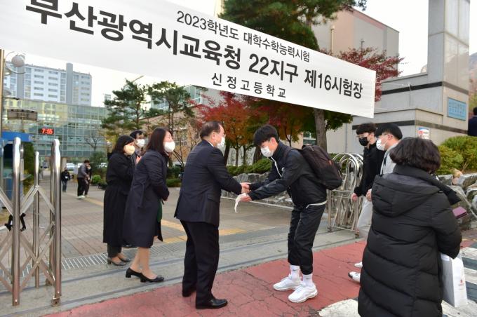 올해 첫 군내 '자체 고사장' 정관고·신정고 2곳 마련돼 하윤수 부산시교육감이 17일 오전 7시30분 지난 1994년 대학수학능력시험 도입 이후 처음 고사장이 생긴 기장군 정관고와 신정고를 방문해 수험생들을 격려했다.