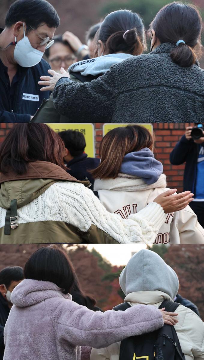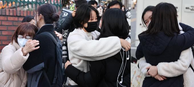 ▲ 2023 대입수학능력시험이 치러진 서울 중구 이화외고 교문 앞. 시험장으로 아이를 들여 보내는 엄마들이 아이를 힘껏 안아주며 격려하고 있다. ▲ 2023 대입수학능력시험이 치러진 서울 중구 이화외고 교문. 엄마들이 시험장으로 들어가는 아이를 배웅하는 마지막 순간까지 등을 토닥여 주며 격려하고 있다. ▲ 2023 대입수학능력시험이 치러진 서울 중구 이화외고 교문 앞에 경찰 순찰차를 타고 내린 한 수험생이 황급히 고사장으로 향하고 있다. ▲ 2023 대입수학능력시험이 치러진 서울 중구 이화외고 교문 앞. 한 엄마가 도시락 가방을 딸에게 건네주며 격려하고 있다. ▲ 2023 대입수학능력시험이 치러진 서울 중구 이화외고 운동장을 한 수험생이 걸어가고 있다. 수험생 앞에 놓인 계단처럼 수많은 인생의 계단을 하나하나 무사히 넘기를 응원한다. KPI뉴스 / 이상훈 선임기자 jow@kpinews.kr