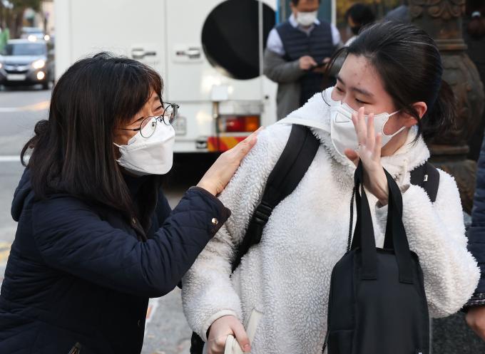 ▲ 2023 대입수학능력시험이 치러진 서울 중구 이화외고 교문 앞. 시험장으로 아이를 들여 보내는 엄마와 딸이 애틋한 표정으로 격려와 인사를 하고 있다. 2023 대입수학능력시험이 치러진 서울 중구 이화외고 교문 앞. 시험장으로 아이를 들여보내는 부모의 마음은 한결같아 보인다. 안아주고, 등을 토닥여 주며 "시험 잘 봐"라고 격려하며 돌아서는 엄마의 응원에 아이들이 평소 실력을 다 발휘하고 시험장을 나오기를 빌어본다.