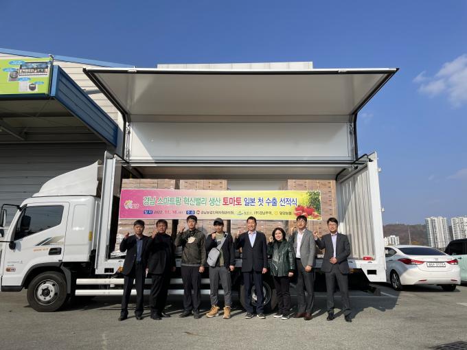 이날 선적 물량은 2톤(4㎏들이 500박스)으로, 스마트팜에서 수확한 '레드칸' 품종의 토마토가 ㈜경남무역(대표 박석모)을 통해 일본으로 수출된다.