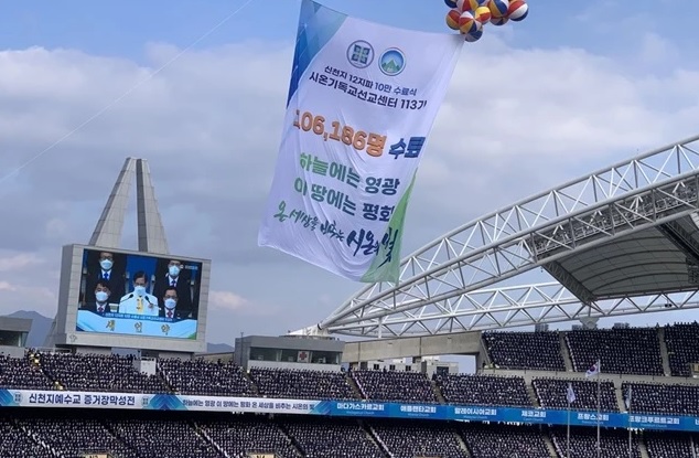 이날 수료생은 총 10만6186명으로, 신학 교육기관으로서는 세계 최대 규모다. 이날 현장에는 8만 명이 현장에 참석했다. 유튜브 등 온·오프라인을 통해 9개 언어로 모두 30만여 명이 수료식한 것으로 집계됐다.