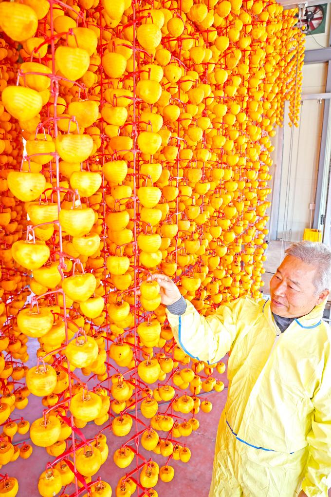 21일 산청군에 따르면 지리산 자락 곳감 농가에서는 최근 고종시(떫은감)를 말리는 작업이 한창이다. 현재 1300여 개 농가에서 명품 곶감을 생산하기 위해 정성을 다하고 있다.