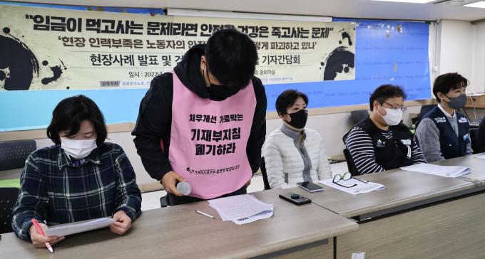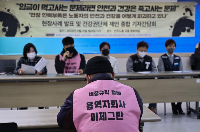 '현장 인력 부족은 노동자의 안전과 건강을 어떻게 파괴하고 있나.' 21일 오전 서울 중구 민주노총 회의실에서 관련 사례 발표와 기자간담회가 열렸다. 노동건강연대 등 건강권 단체와 공공운수노조가 공동 주최했다.