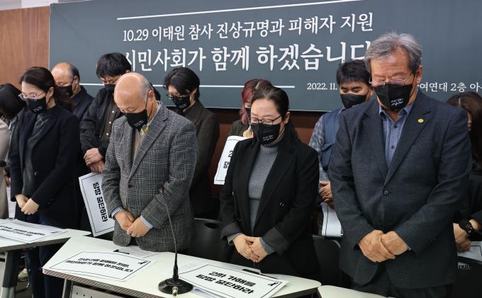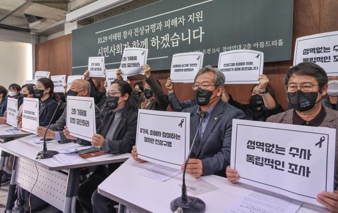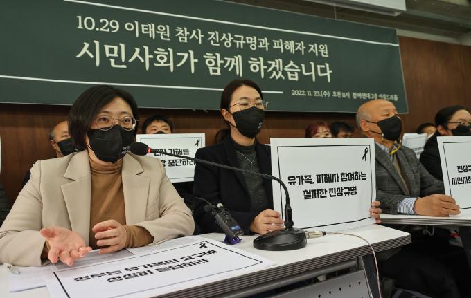 23일 오전 '10·29 이태원 참사 진상규명과 피해자 지원, 시민사회가 함께 하겠습니다' 기자회견이 서울 종로구 참여연대 아름드리홀에서 열렸다. 재난·산재 참사 피해자 단체와 종교·시민사회·노동단체가 주최했다.