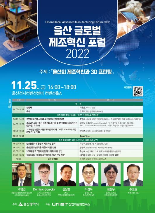 UNIST(유니스트·울산과학기술원)와 울산시는 25일 오후 2시부터 6시까지 UECO에서 '울산 글로벌 제조혁신 포럼 2022'를 개최한다. 이번 포럼의 주제는 '울산의 제조혁신과 3D프린팅'이다.