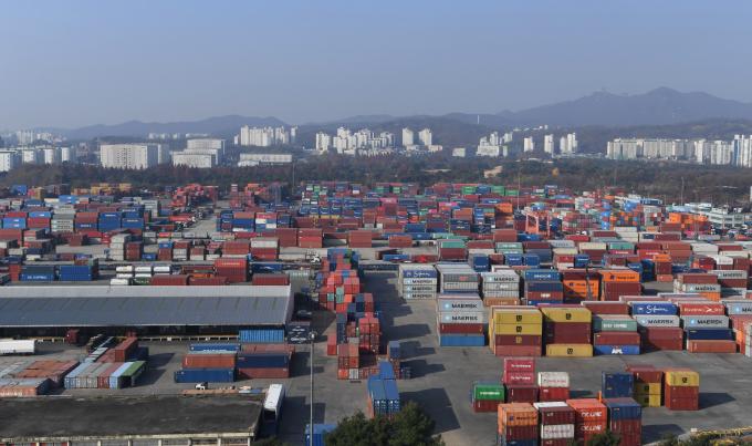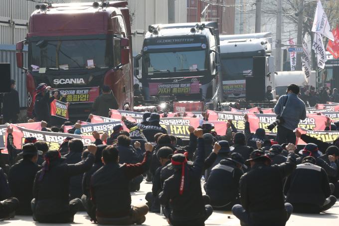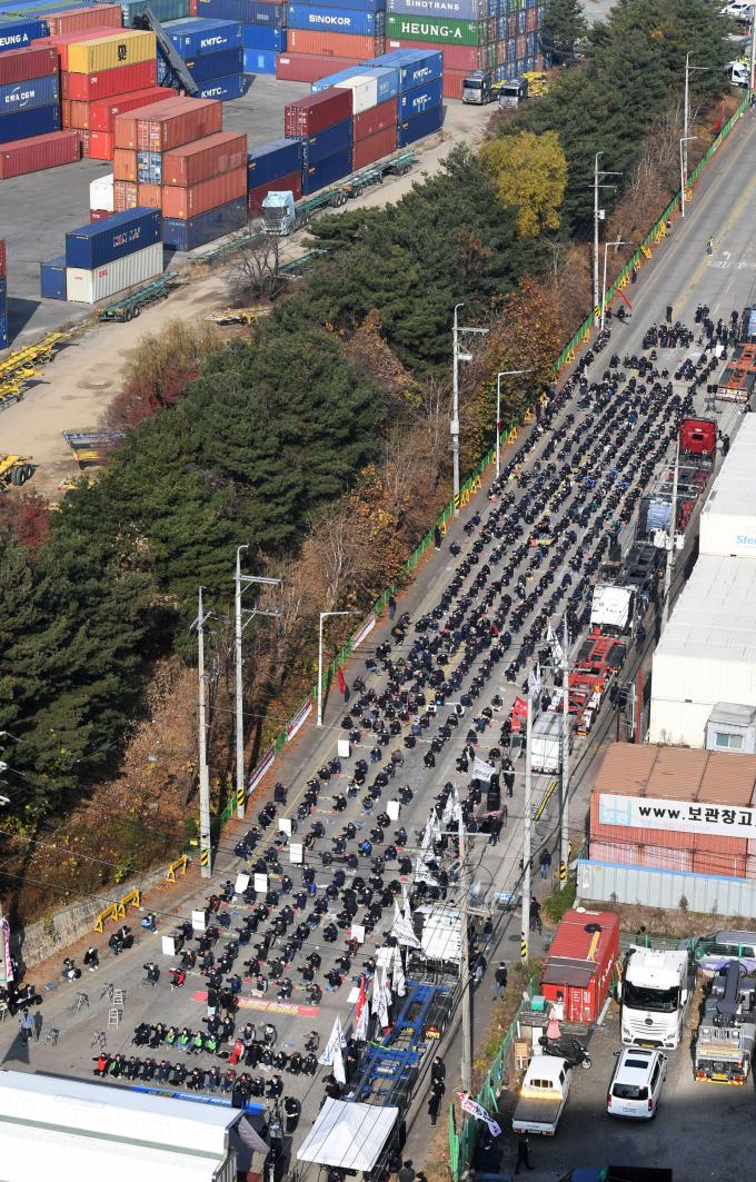 화물연대 노동자들이 24일 오전 경기 의왕시 내륙컨테이너기지(ICD) 오거리에서 화물연대 총파업 출정식을 열고 안전운임제 일몰제 폐지와 적용 차종·품목 확대 등을 요구하며 구호를 외치고 있다.