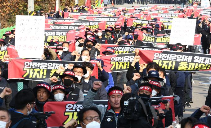 이날 0시를 기해 무기한 전면 총파업에 돌입한 화물연대는 "지난 6월 7일 총파업 돌입 후 6월 14일 안전운임제 지속 추진과 품목확대 등의 논의를 이어가기로 국토부와 합의 후 총파업을 유보했었다"며 "합의 당사자인 국토부가 앞장서서 안전운임제 도입 취지를 정면으로 부정하며 합의를 파기하기에 이르렀다"고 했다.
